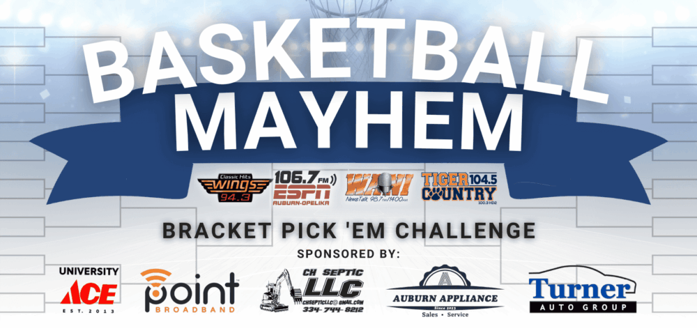 The madness is here! It is March after all and that can only mean one thing: Basketball Mayhem! Make your picks now in our 2026 Basketball Mayhem Bracket Challenge for your chance to win a grand prize courtesy of University ACE, Point Broadband, CH Septic, Auburn Appliance, and Turner Auto Group! One lucky winner will receive a gift pack including a Yeti roadie cooler, two VISA gift cards, custom Weather Tech floor mats, table top ice maker, and a smart TV! The winner will be contacted after the NCAA tournament concludes.